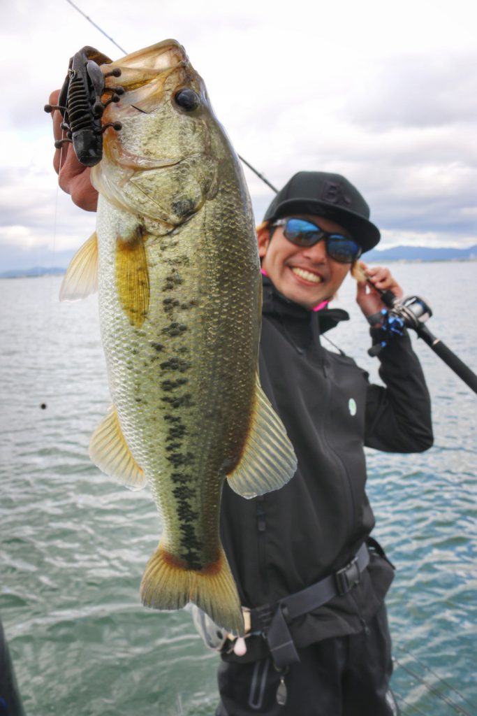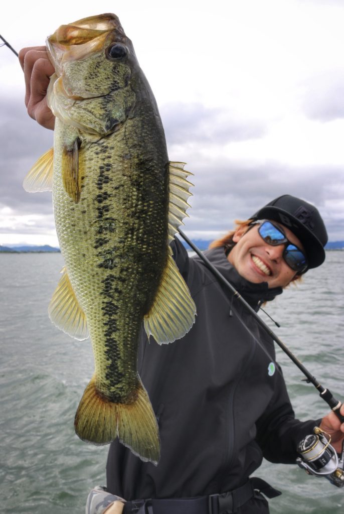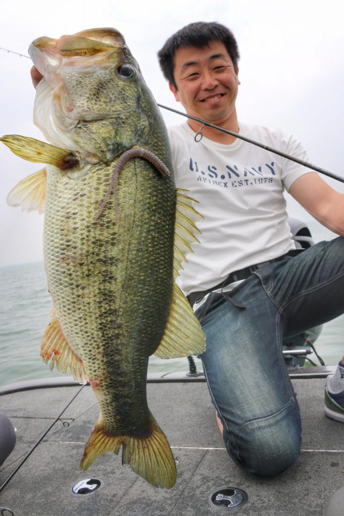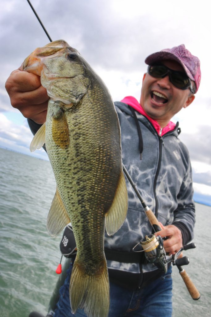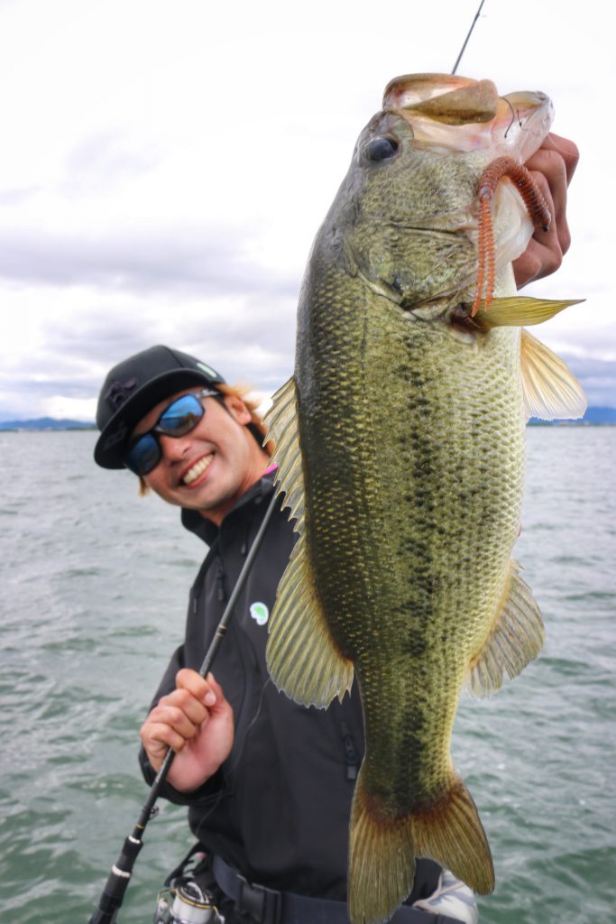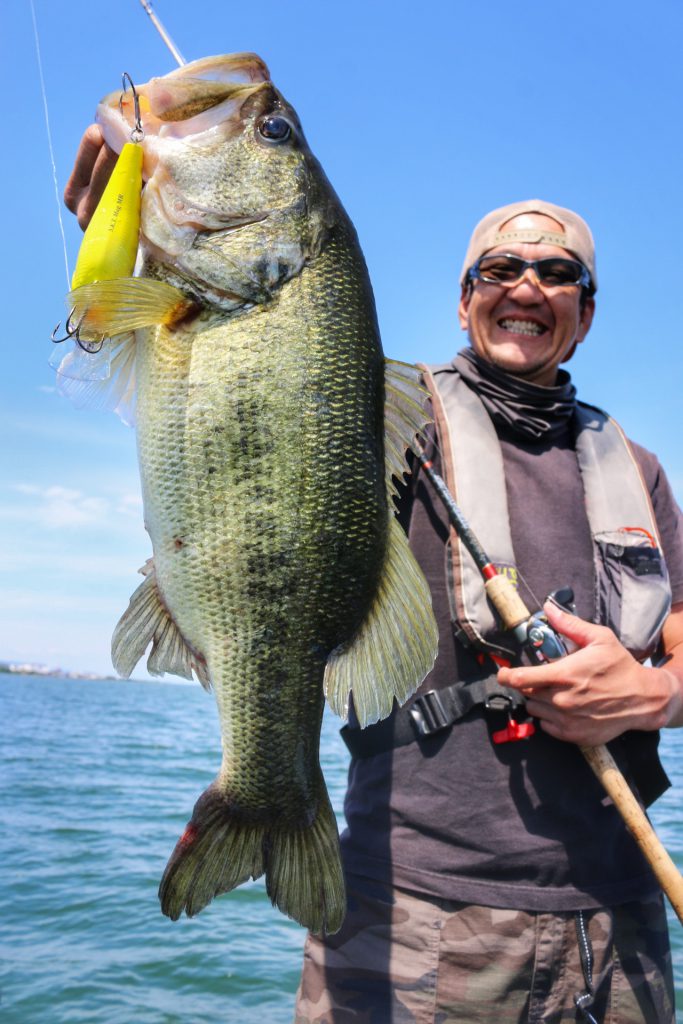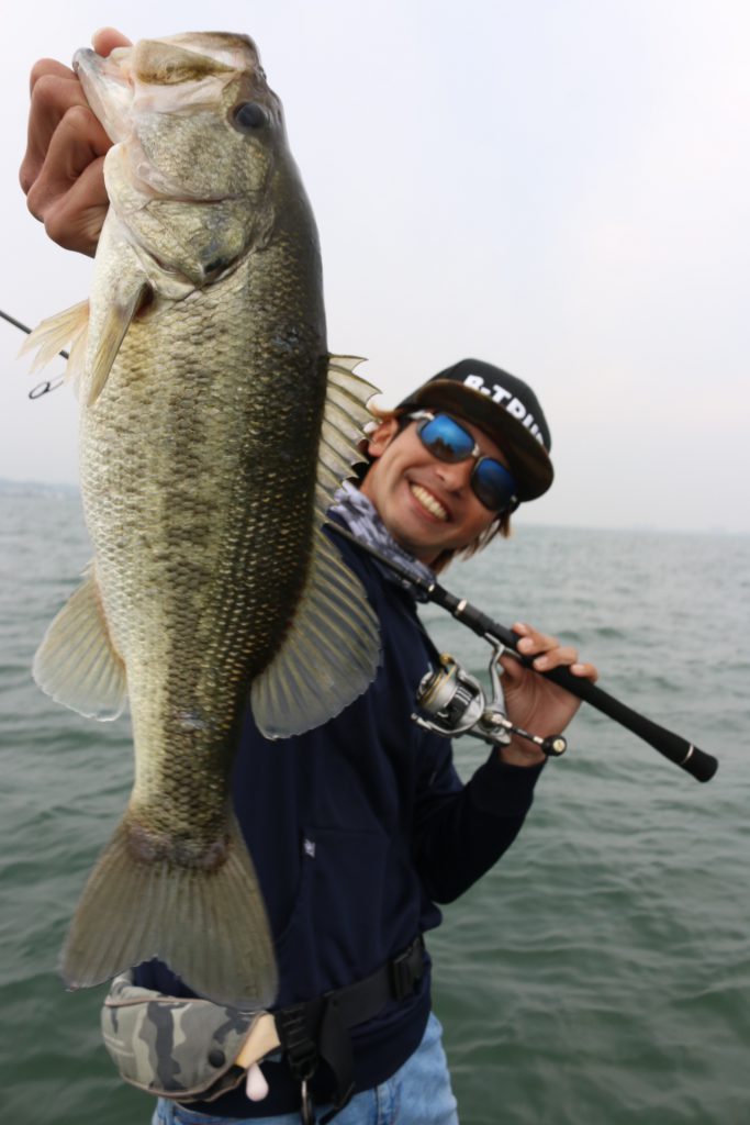 このバスは上の写真のバスとは違うけど、通常Hクラスのロッドではフッキングが決まりづらい時でもパワープラント71XXでやってみるとこの通り相性抜群!!