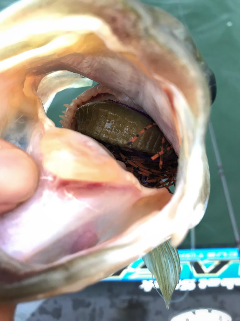ピンキーさん、春から好調やったのがグラスリッパーのブラウンパープルにヘッドシェイカー5がマイティーゴールドの組み合わせみたいで、このカラーの組み合わせ調子良いんよー♪っと投げてたらゴンっ!!