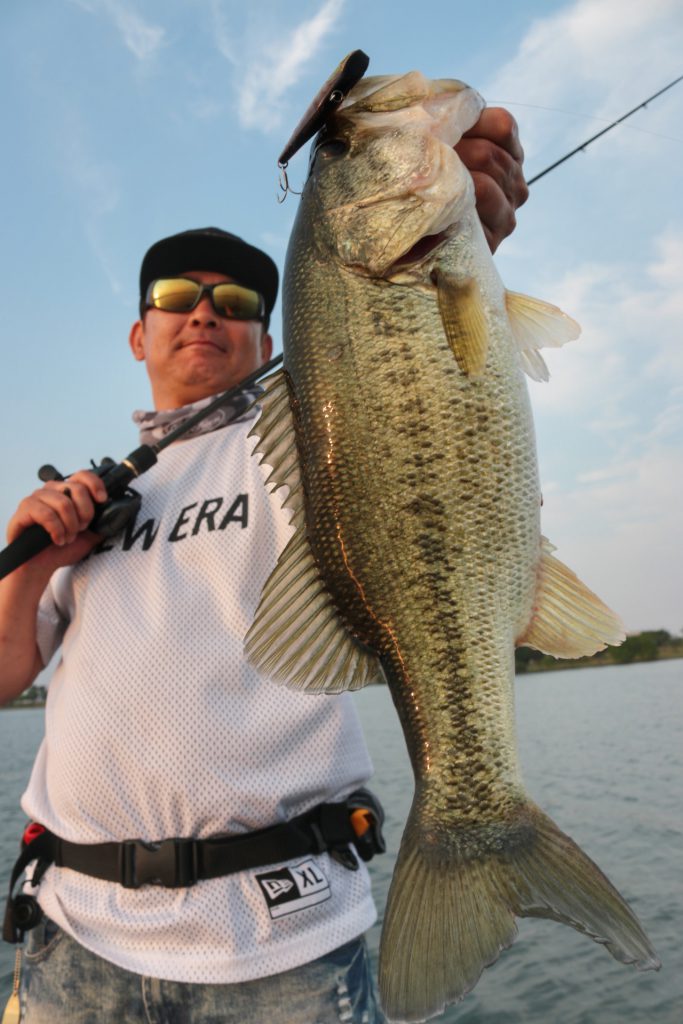 ロッドはORIONオライオン ムーンゲイザー69MHにリールはSLXdc、ラインはバスザイルマジックハードR16lbです。