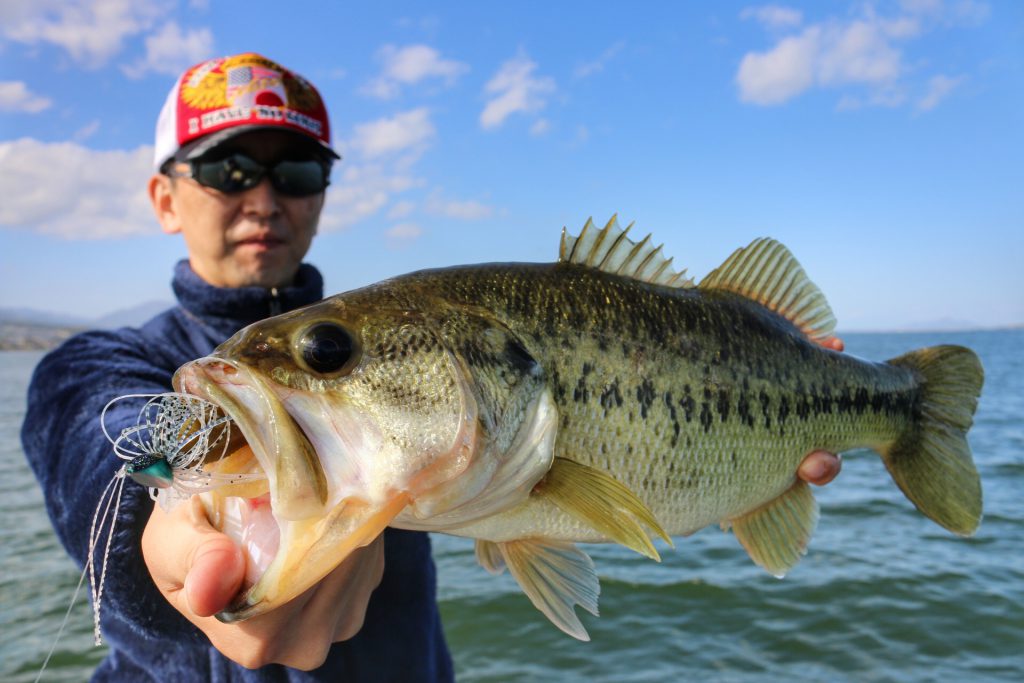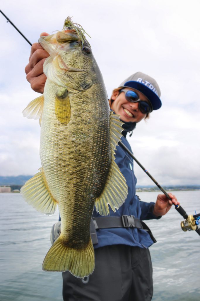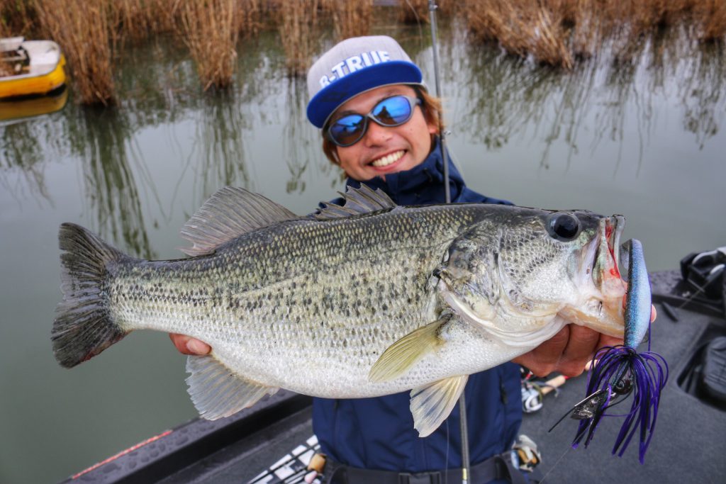 新芽が少し生え出してきたフラットエリアでも反応出てきたので、スイミングジグで巻ききり♪